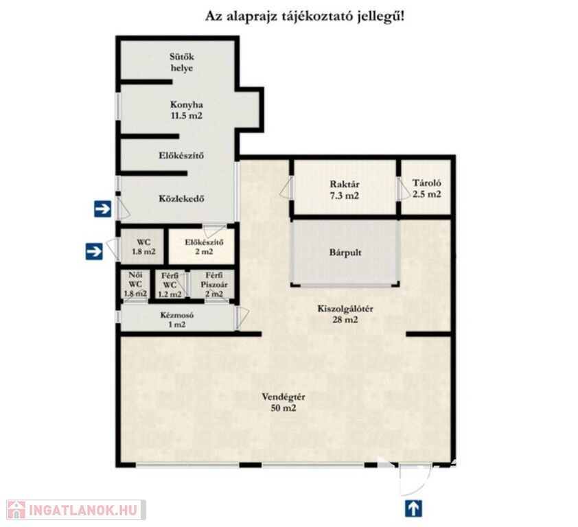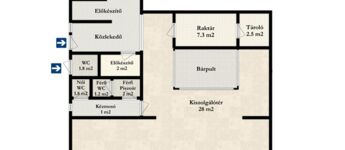 Az ingatlan elrendezése tökéletesen kiszolgálja mind a vendéglátás, mind pedig egyéb kereskedelmi tevékenységek igényeit. A 50 m²-es vendégtér világos és jól kihasználható, a kiszolgálótér és a bárpult kényelmes munkavégzést tesz lehetővé. A konyha és az előkészítő helyiség adott, emellett raktárak és tárolók biztosítanak elegendő helyet az alapanyagok vagy áruk tárolására. Az ingatlan rendelkezik külön női, férfi és személyzeti mosdókkal, így teljes mértékben megfelel a működtetéshez szükséges előírásoknak.
