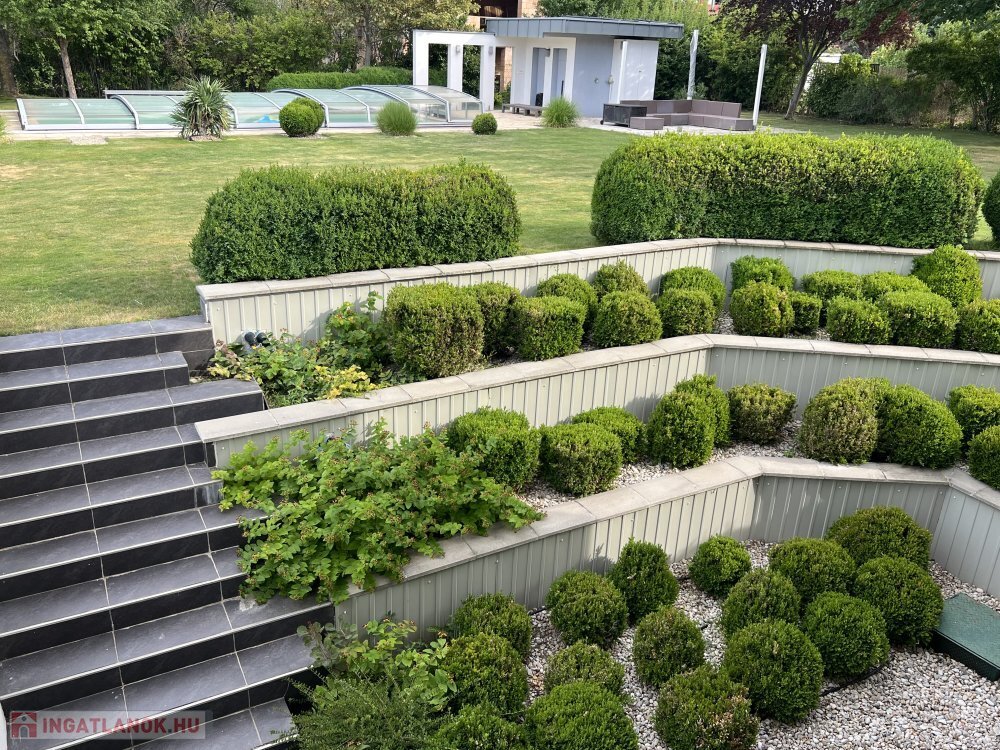 Kert: különálló, locsolórendszerrel, díszkerttel, burkolt parkolóval (4-5 autó részére)