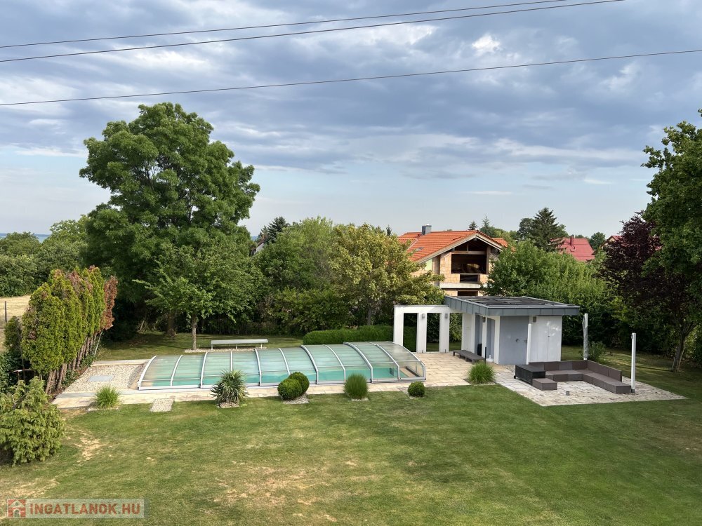 Balatonfüred: A hasonló méretű, medencével, napelemmel és vendégházzal rendelkező exkluzív ingatlanok 750–950 millió Ft közötti sávban mozognak.