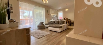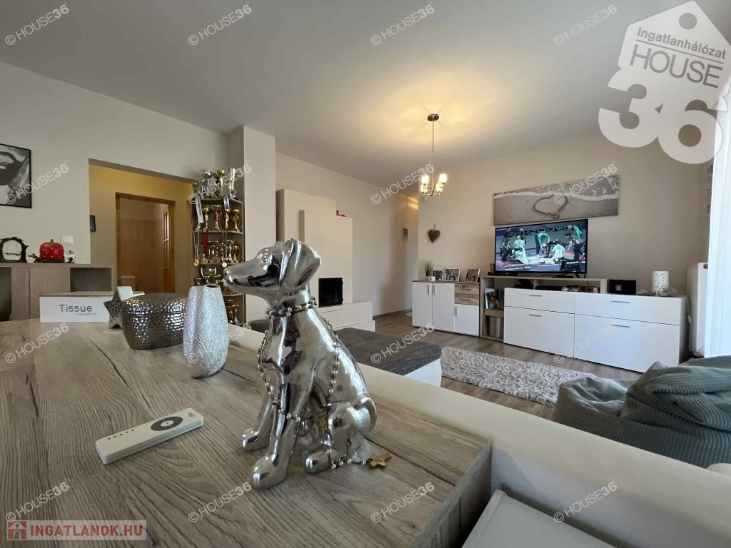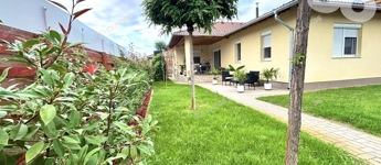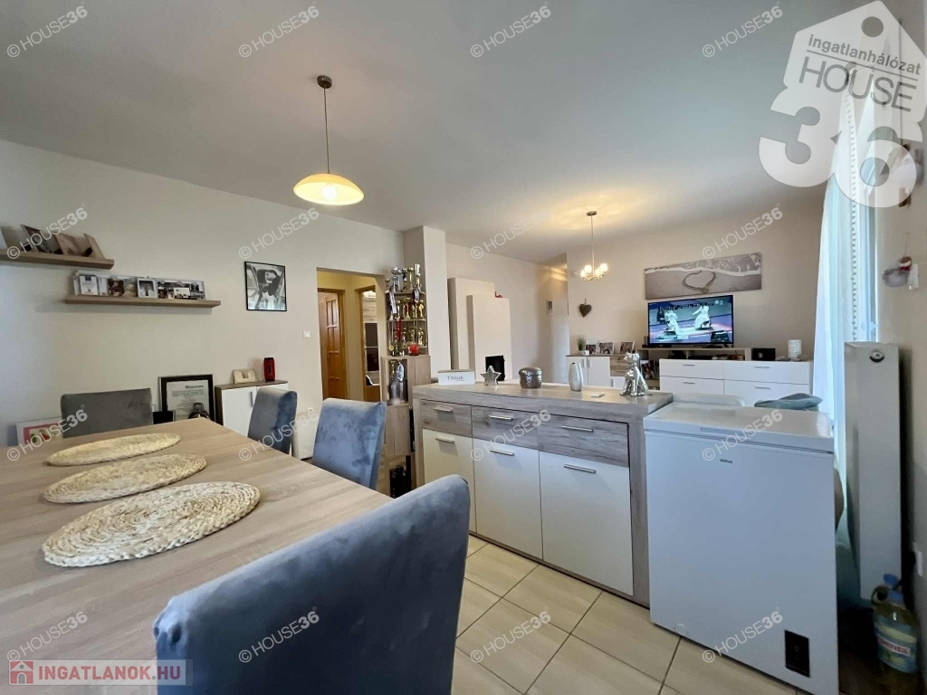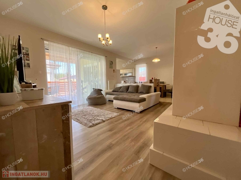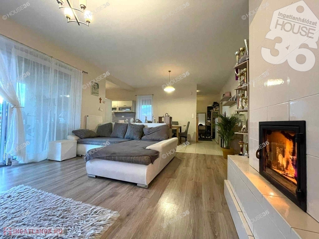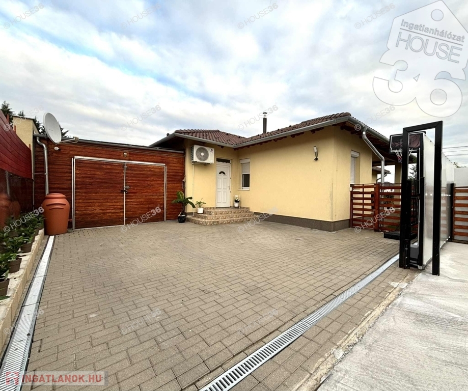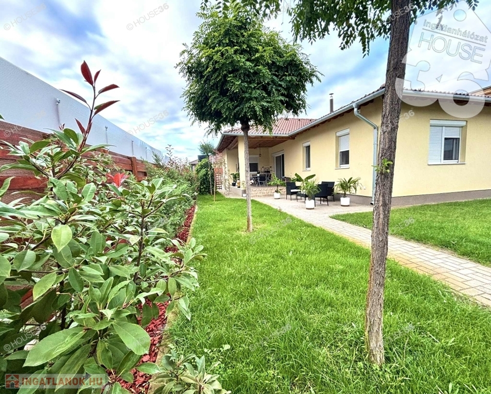 Az ingatlan nappaliból, három külön nyíló szobából, háztartási helyiségből, garázsból és egy 17 m2;-es fedett teraszból áll. A gondosan parkosított udvar és a térkövezett bejáró igényes külső környezetet biztosít.