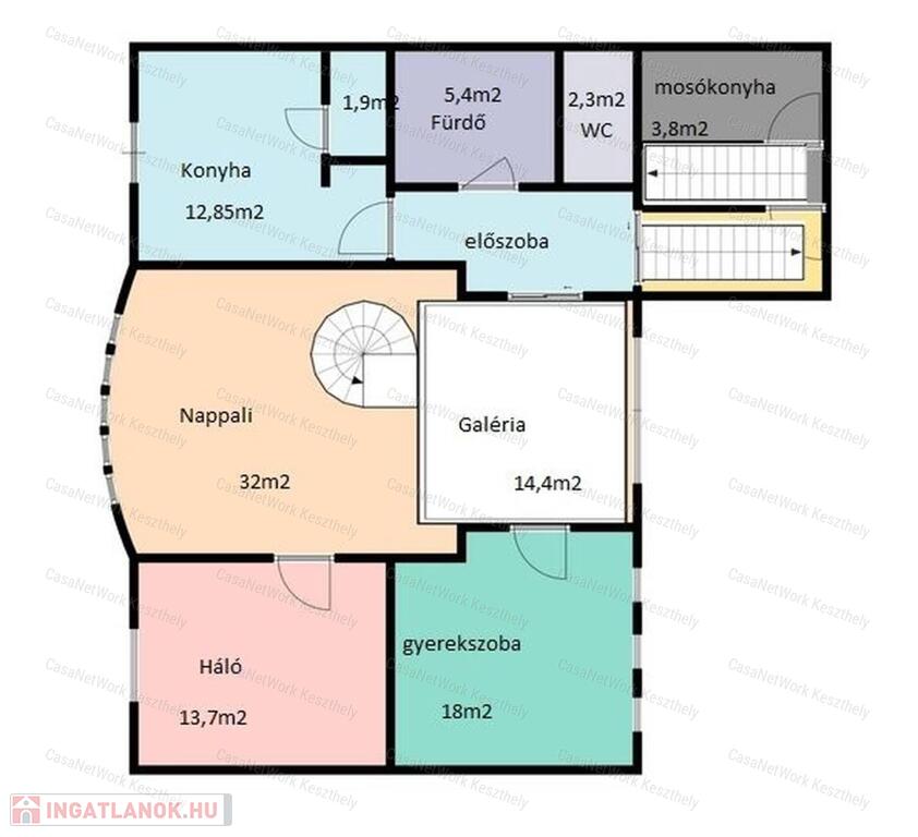 Emeleti szint: 3 szoba, ebből a 32 m²-es nappali galériás kialakítású, előszoba, konyha, spájz, fürdőszoba, wc, összesen 120 m².