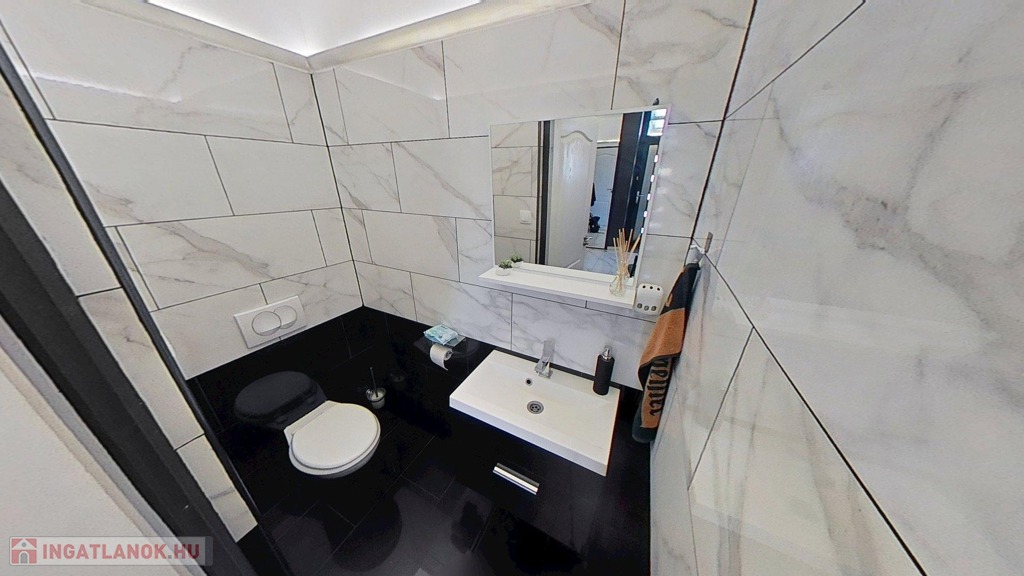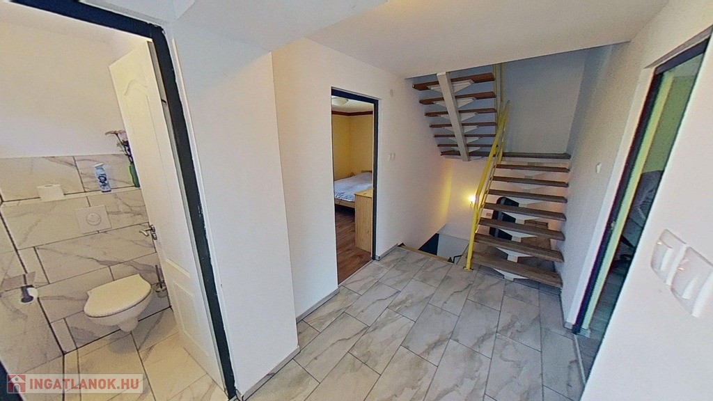 A földszinten további - saját fürdőszobás - hálószoba, utcafronti bejárattal is rendelkező iroda, félszoba, és egy wc/kézmosó is található.