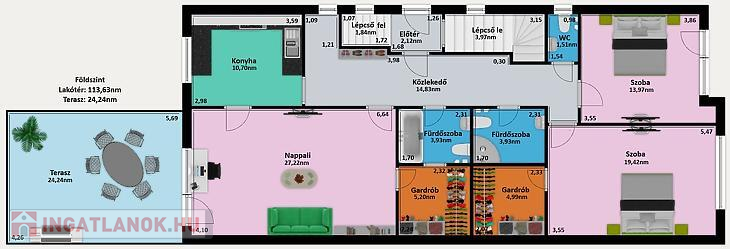 • Földszint: nappali, 2 szoba, 2 gardrób, 1 konyha, 2 fürdőszoba, 1 külön wc található. A nappaliból nyílik egy 24,24nm-es terasz közvetlen kertkapcsolattal.