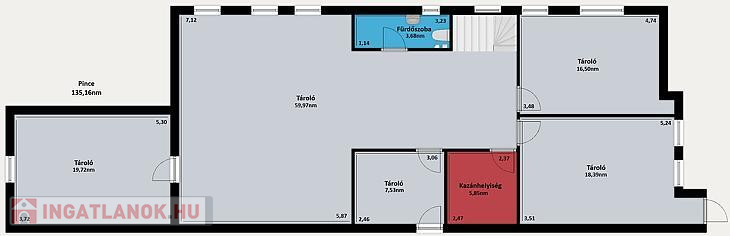 • Pince: 5 ablakos helyiség, 1 kazán helyiség és egy fürdőszoba található. Ez a szint abszolút alkalmas fitnesz, wellness kialakításra, de irodának vagy tárolásra is kiváló.