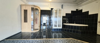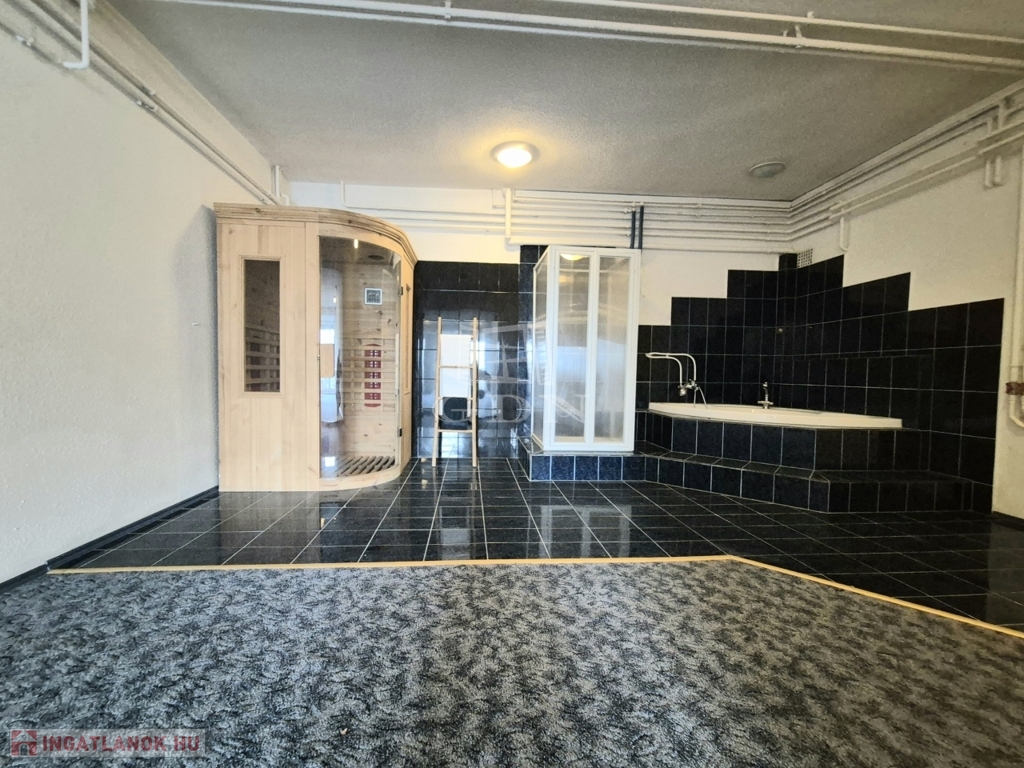 A lakószintekkel kapcsolatos szuterén szinten az elektromos kapuval zárt garázson túl egy wellness részleg is kialakításra került, aminek része egy medence és szauna.