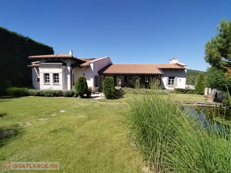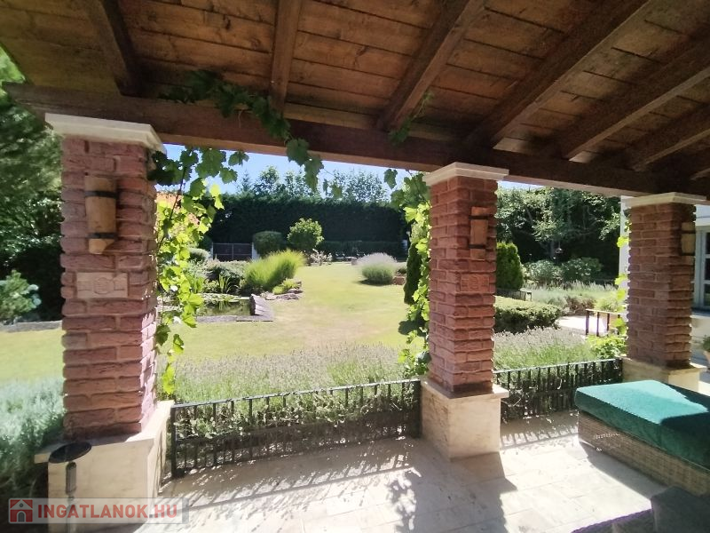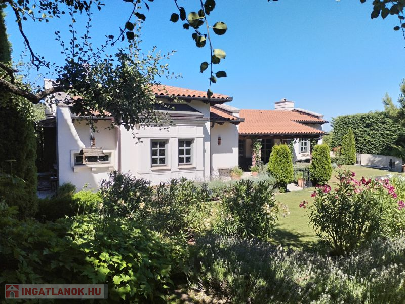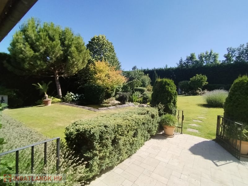 A házat körülölelő álomszép kertben kis pihenők, tavirózsás halastó, gyönyörű növényzet, mely nemcsak szemet gyönyörködtető, de maximális intimitást is biztosít az itt lakóknak.