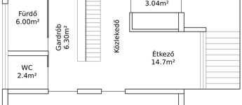 FELSŐ SZINT : közlekedő, nappali szoba loggiával, hálószoba, zuhanyozós fürdőszoba wc-vel. A padlás a tetőtérből közelíthető meg, ahol még egy 11 m2-es tároló is kialakítható.
