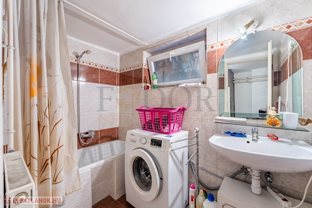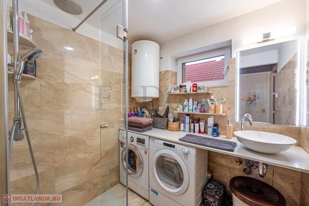 A földszinten egy délnyugati tájolású nappali, külön bejáratú zuhanyzós fürdő és WC, valamint egy konyha-étkező helyiség található. A konyha gépészettel (tűzhely, sütő, szagelszívó) felszerelt, amelyek a vételár részét képezik.