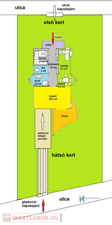 A ház két utca felől is bejáratos, KÉNYELMESEN és PRAKTIKUSAN lehet a gépkocsival beállni.