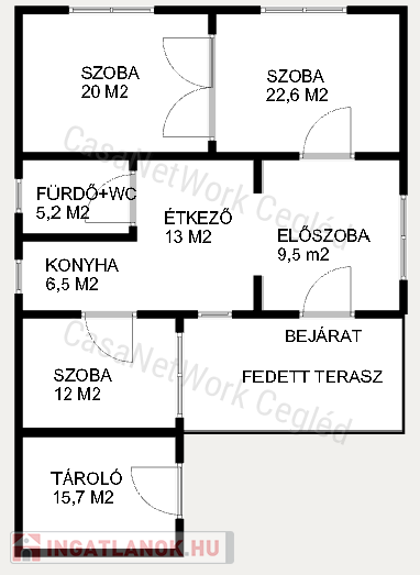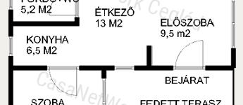 előszoba (9,5 m²), konyha (6,5 m²), étkező (13 m²), valamint fürdőszoba és WC