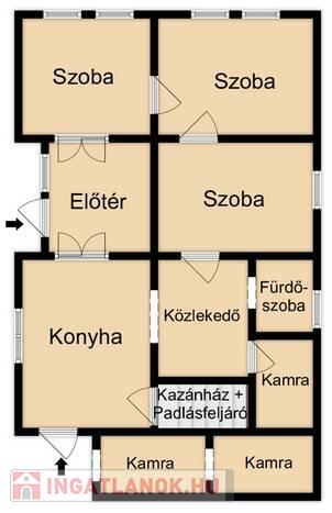 - Előtér, 3 szoba, fürdőszoba illemhelyiséggel, közlekedő, konyha, 3 kamra lett benne kialakítva.