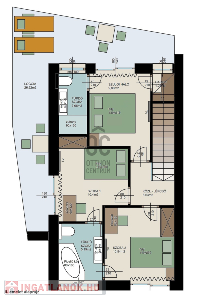 II. emeleti részen: szülői hálószoba gardróbbal és saját fürdőszobával, valamint 2 hálószoba külön fürdőszobával és erkély vagy teraszkapcsolattal