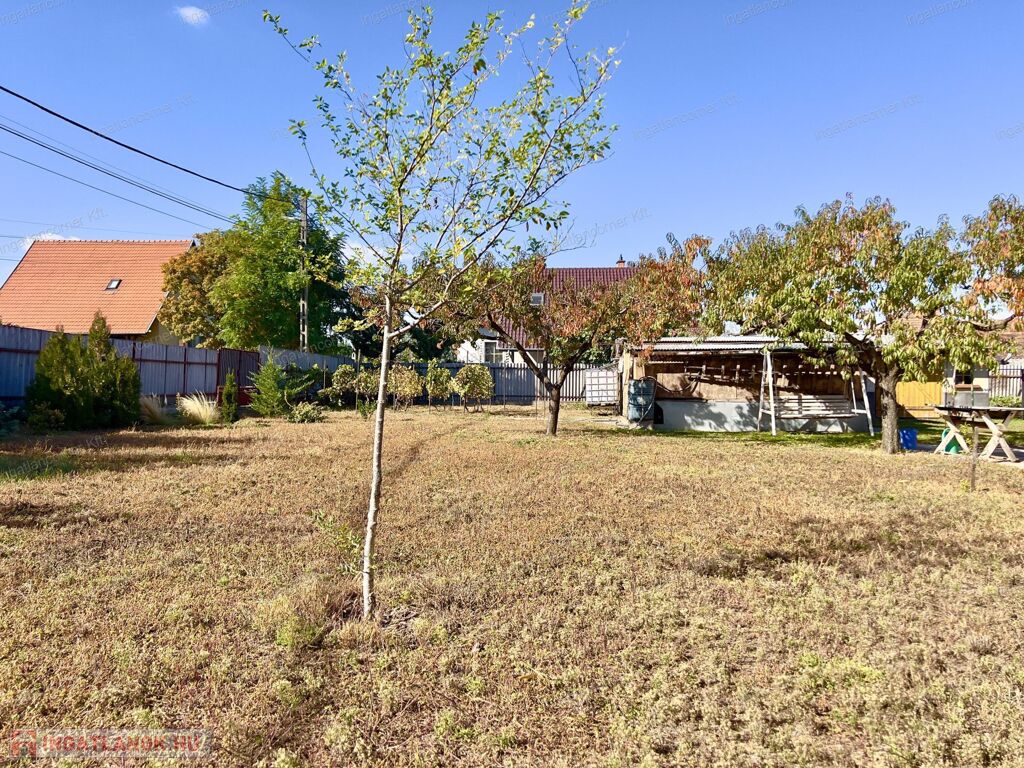 Termő gyümölcsfák, ápolt - gondozott telek, friss bokrokkal ültetve, a kerítés tövében.