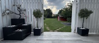 Nagy, térkövezett udvar, magas tető alatti autóbeállóval, akár több autó vagy teherautó parkolására is alkalmas