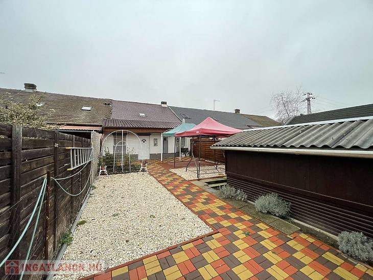 A házhoz 120 nm saját kert tartozik viakolor burkolattal, továbbá 18 nm-es garázs és kocsibeálló. A gáz telken belül, de az lakásban nincs bent.
