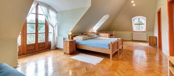 Az emeleti szinten, 4 tágas, napos hálószoba ( 30- 30- 36- és 11 nm ), 2 fürdőszoba, 2 terasz, és egy teakonyha található.