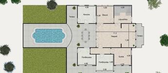 A 110 nm-es terasz kényelmes teret biztosít a pihenésre és kikapcsolódásra. Itt található a 4 x12 m-es (1,5m mélységű) medence is. A jól átgondolt kialakítás része egy a medence használathoz kialakított, közvetlenül megközelíthető fürdőszoba.