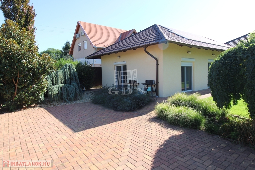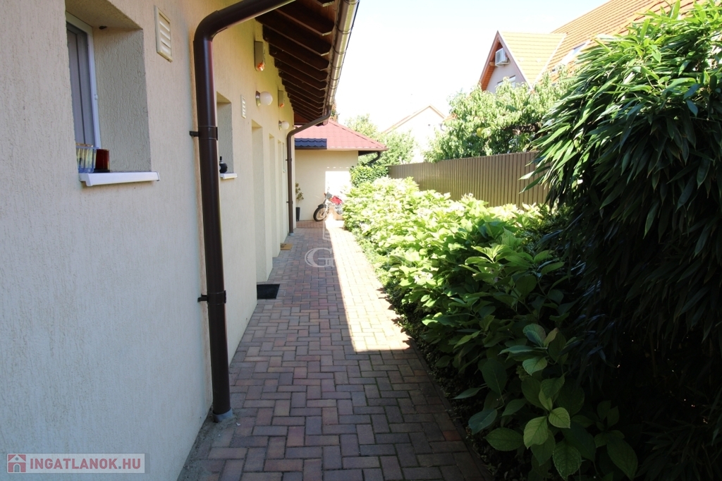 Eladásra kínálok csendes kertvárosi környezetben egy 711nm-es telken, 2020-ban épült, 208nm-es, körbejárható, téglaszerkezetű, szigetelt, klimatizált apartmanházat, saját autóbeállóval, parkosított kerttel, térkövezett saját használatú teraszokkal.