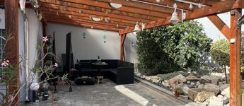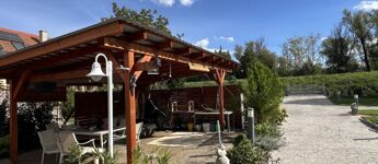 Az udvaron helyett kapott egy fa szerkezetű, fedett pergola, mely a mindennapok és a társas összejövetelek kényelmét szolgála.