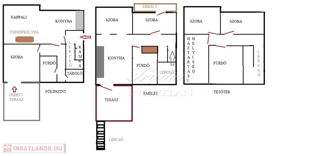 Az emeleti szint a hátsó terasz irányából is megközelíthető, itt egy étkezős konyha (még nem használt, vadonatúj konyha, felső kategóriás gépekkel) , egy fürdőszoba, valamint 2 szoba található, amelyből az egyik szoba nappaliként a másik pedig egy saját erkéllyel rendelkező hálószobaként funkcionál. A tetőtérben további két kellemes méretű hálószoba, a háztartási helyiség és a harmadik fürdőszoba található.