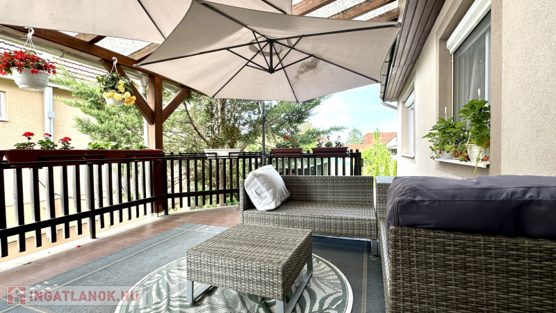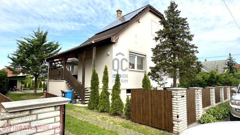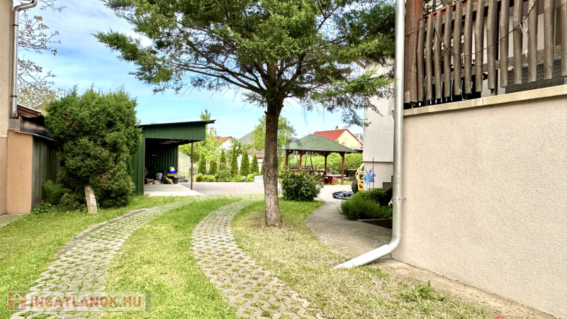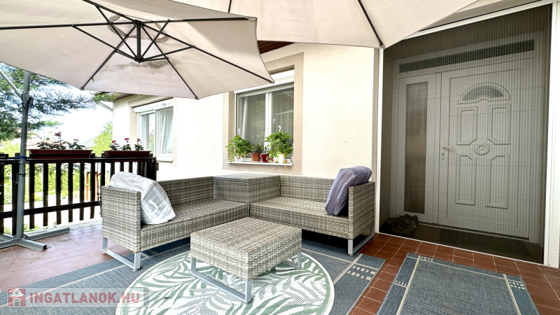 A 104 m²-es lakótérhez egy 115 m²-es szuterén tartozik, valamint a tetőtér beépíthető, így az ingatlan szinte korlátlan bővítési lehetőséget kínál. A ház egy 782 m²-es, parkosított telken helyezkedik el, automata öntözőrendszerrel, fúrt kúttal és fedett terasszal.