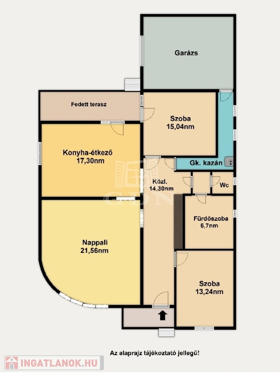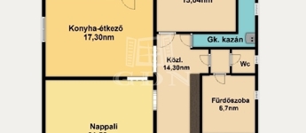 Helyiségek:Nappali+ kettő szoba, fürdőszoba, külön wc, tároló-kazánház, közlekedő- előszoba helyiségekből áll, valamint egy 12nm-es terasz ami a hálóból-valamint a konyha étkezőből egyaránt megközelíthető.