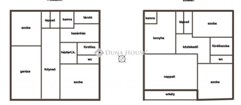 A földszinten 2 szoba, fürdőszoba, wc, tárolók, kazánház és a garázs található, az emeleten 3 szoba, fürdőszoba, wc, konyha, spájz és a kovácsoltvas korlátos erkély.