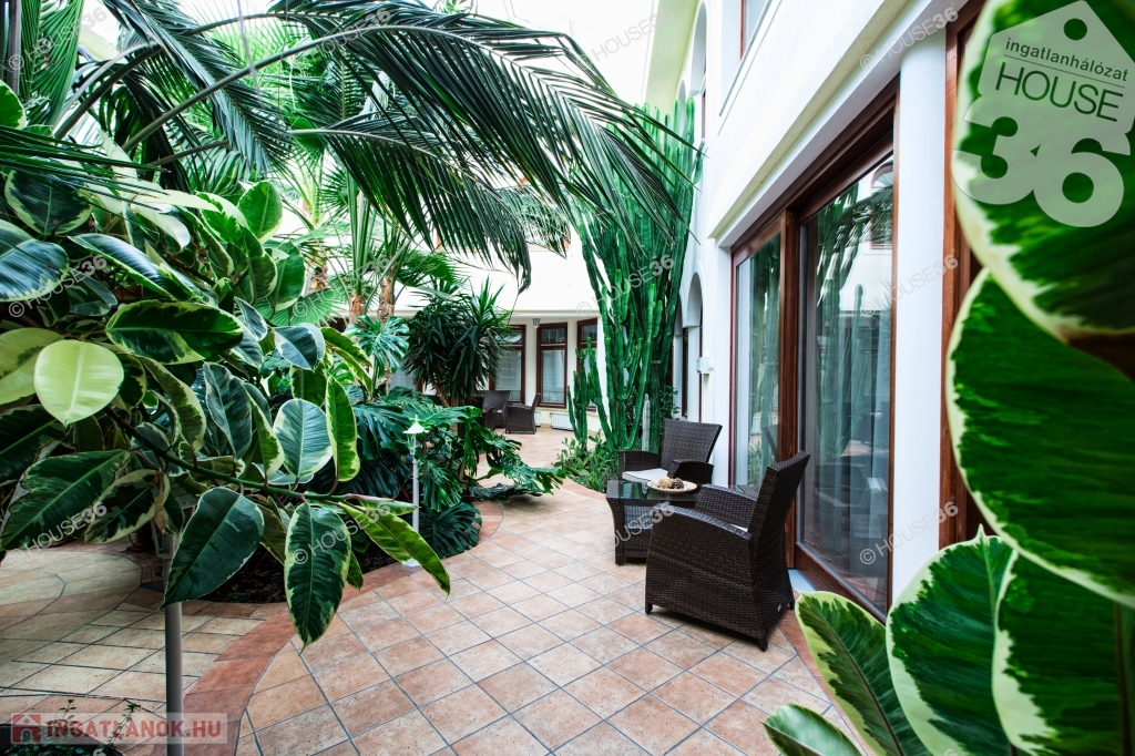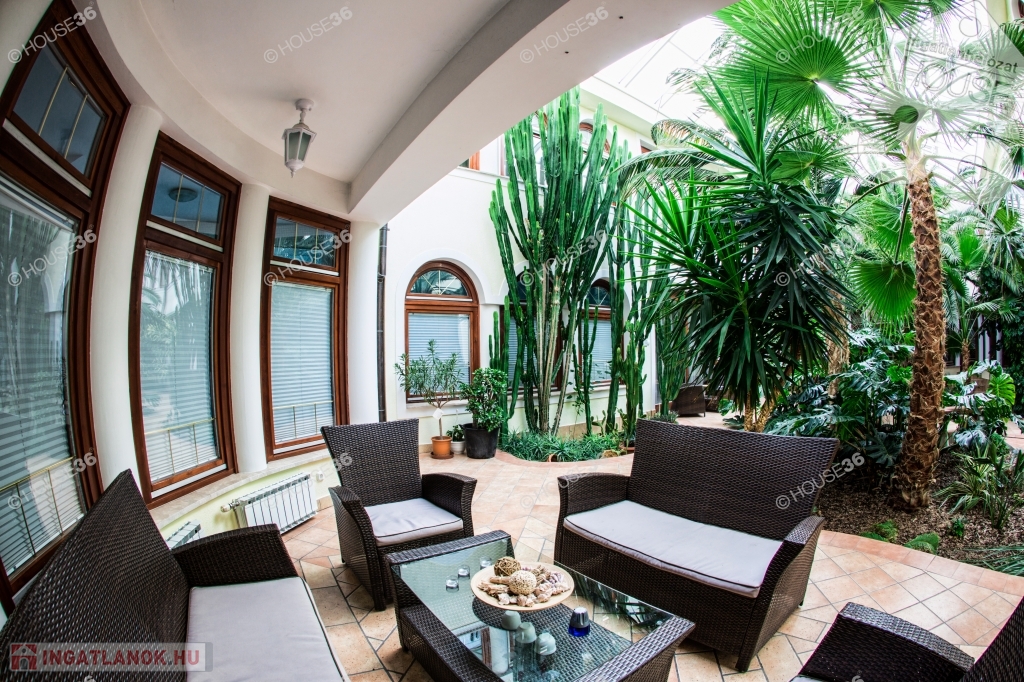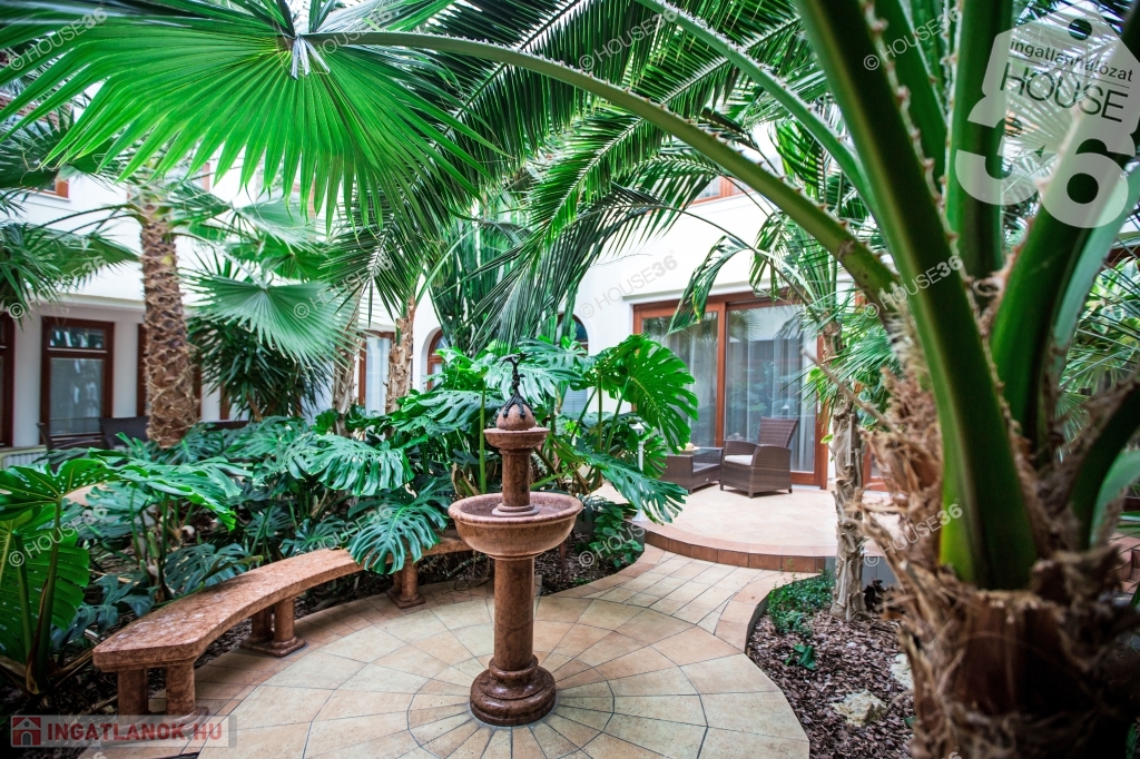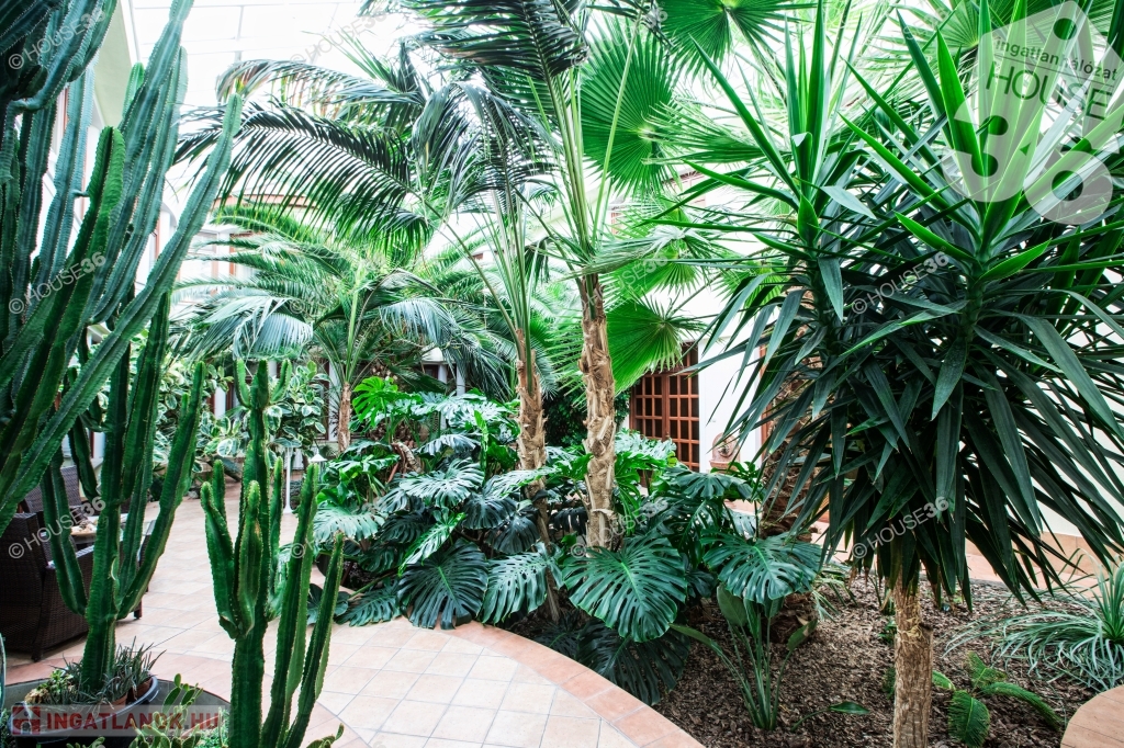 -télikert, egyben átrium is, melyben egzotikus pálmafák, japánkert, kaktuszpark (vörösmárvány szökőkút)
