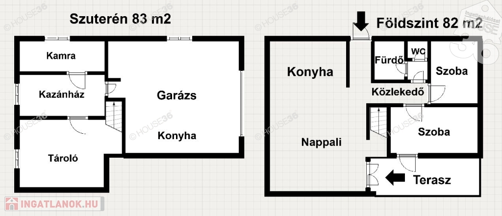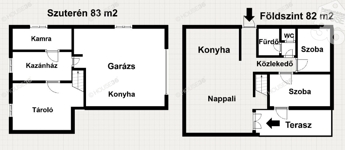A ház alatt található egy 83 m2-es szuterén, amelyben helyet kapott egy külön konyha, garázs, tároló, spájz és a kazánház.