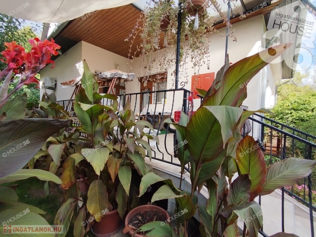 A szépen gondozott, parkosított telken található egy autó beálló is.