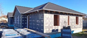 A ház beton alapra, 30-as Porotherm téglából, fa födémmel, Bramac antracit színű betoncserép fedéssel épül meg.