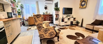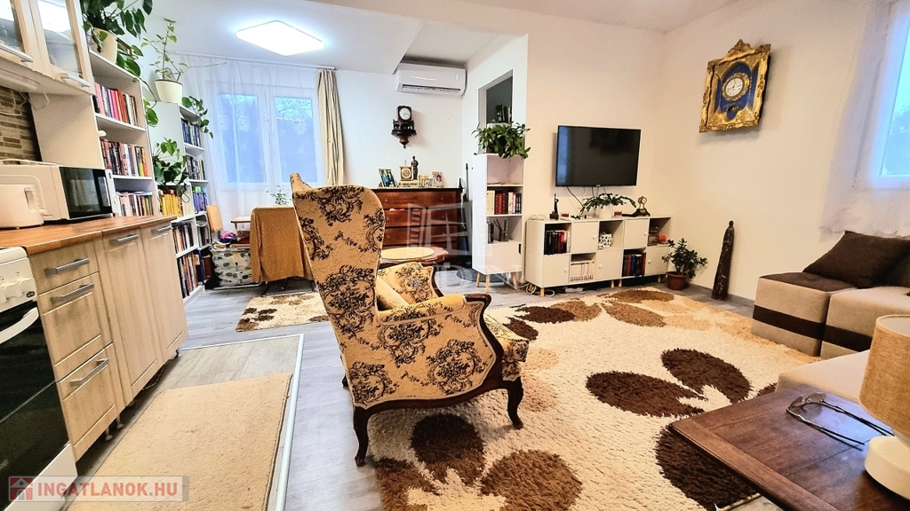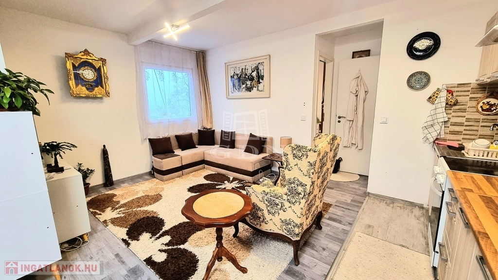 Az épület felújított felső szintjén előszoba, amerikai konyhás nappali, hálószoba, fürdőszoba található.
