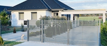 A teljesen sík, gondozott, bekerített telek biztonságos és kellemes környezetet biztosít, ahol a tágas terasz, a fedett kocsibeálló és az esztétikus tároló is a kényelmet szolgálja.