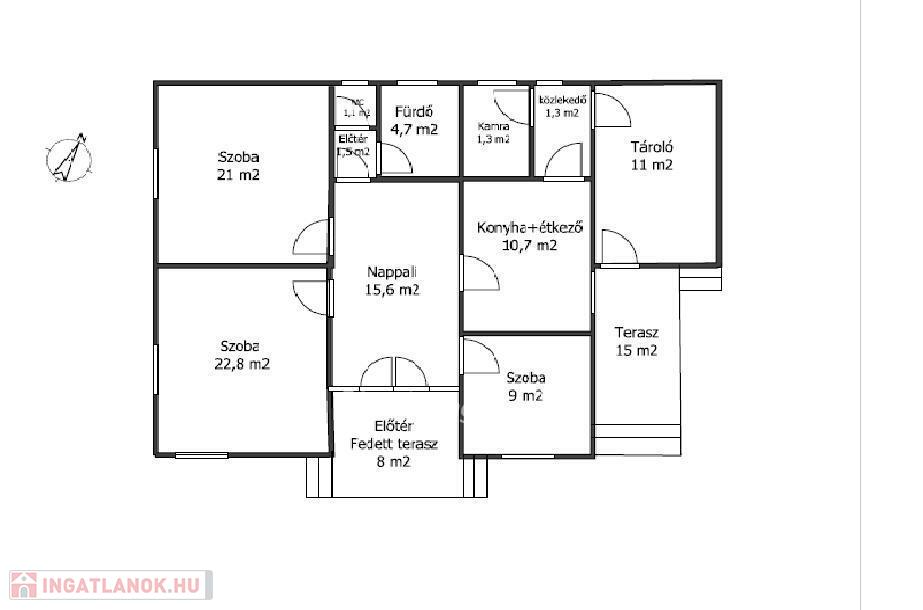 Az ingatlan belső elrendezése nagyon partikus: minden helyiség külön-külön nyílik a nappaliból. A házhoz az udvar felöl nagyobb tároló és udvarra néző terasz kapcsolódik. A melléképület és a kert akár gazdálkodásra is alkalmassá teszi az ingatlant.