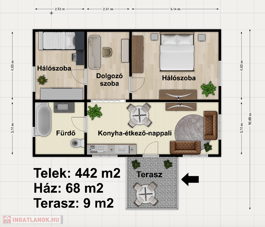 - Az épület előtt található egy 3x3m-es fedett terasz