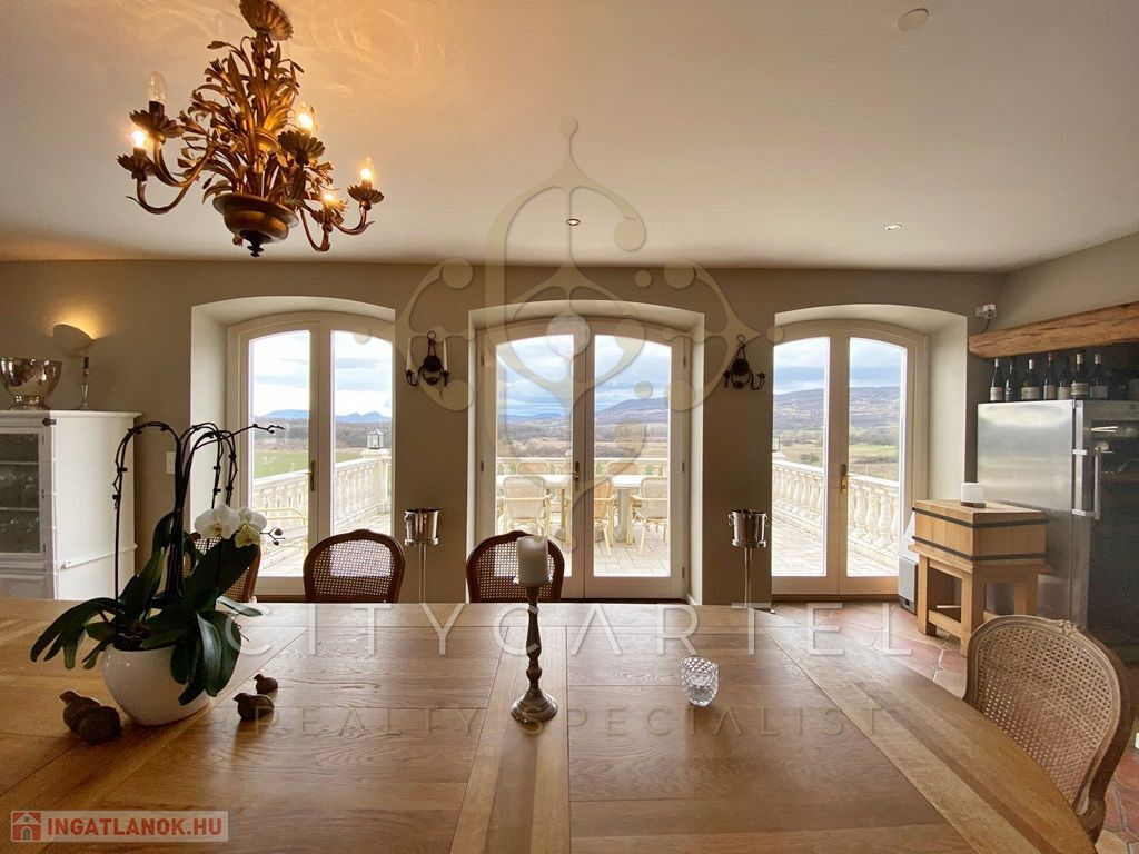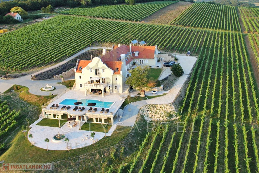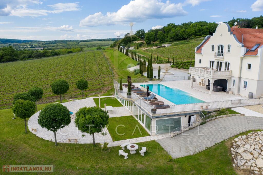 FESTŐI környezetben, a Balatonhoz közel kínálok eladásra egy francia Chateaux stílusban megépített, eklektikus, CSODÁLATOS panorámás, 2250 nm alapterületű, FELÚJÍTOTT, 3 szintes, 9 szobás BORBIRTOKOT a hozzá tartozó 10 hektárnyi szőlőtermő területtel!