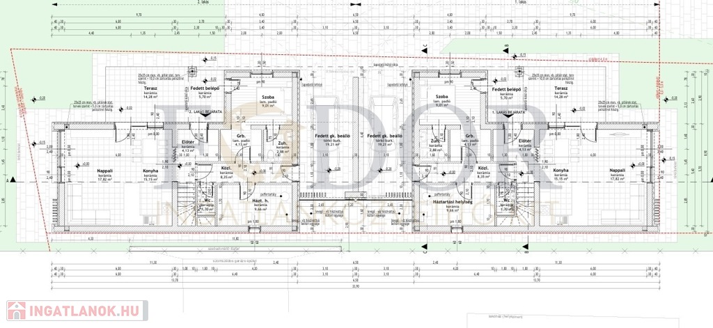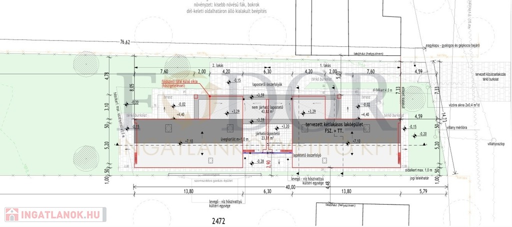 Az 1239 nm-es telekre 1 db ikerház kerül megépítésre, minden ingatlanhoz kerítéssel leválasztott telek terület tartozik. Az utcafronti 1. számú ingatlanhoz tartozó telekterület: ~250 nm, terasz 14 nm +4 nm tetőterasz, a hátsóudvar felőli ingatlanhoz: ~1000 nm telekterület, terasz 14 nm + 4 nm tetőterasz . A lakások kizárólag fedett kocsibeállóval kapcsolódnak, ezáltal az ott élők egymás nyugalmát nem zavarják.