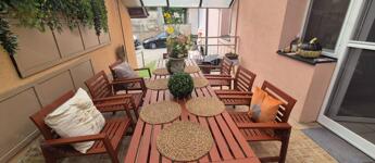 Tágas nappali-étkező, stílusos konyha, előszoba, külön WC, tágas fürdőszoba, valamint egy hálószoba gardróbbal. A konyhából közvetlen kijárat nyílik a 15 nm-es teraszra.