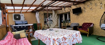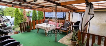 A házhoz egy hatalmas, fedett hátsó terasz is tartozik, ami ideális helyszín reggeli kávézáshoz, családi étkezésekhez és baráti összejövetelekhez, akár esős időben is. A kertben épített kemence és grillsütő igazi gasztronómiai élményeket ígér.