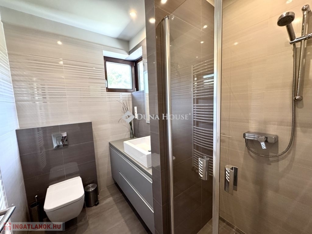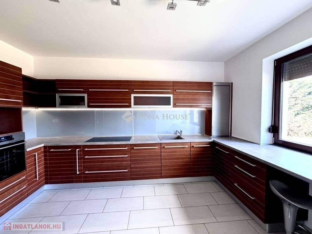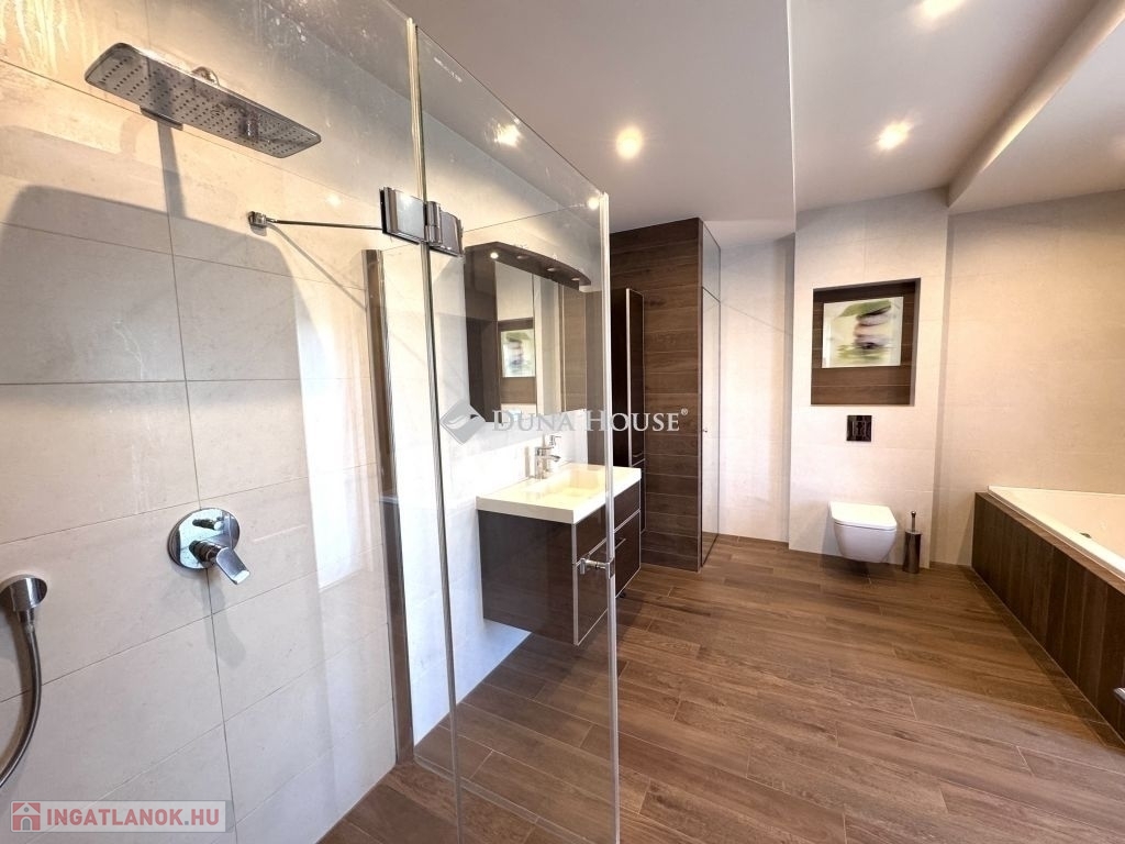 Alsó szinten előszoba gardróbbal, vendégszoba, vendégfürdő, valamint egy elegáns nappali kandallóval, étkező és modern konyha kamrávalÉtkezőből közvetlen kijárat a 40 m²-es teraszra és a parkosított kertbeFelső szinten dolgozósarok, szülői háló külön gardróbbal és 20 m²-es fürdőszobával (szauna előkészítés)Két további hálószoba, plusz egy fürdőszoba a folyosóról nyílóanKét 40 m²-es erkély, az egyiken jakuzzi.