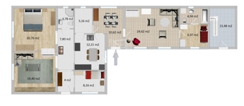 A ház téglából épült, és tágas, jól tagolt terekkel rendelkezik: három hálószoba, egy félszoba, valamint különálló nappali, konyha, étkező biztosít kényelmes életteret. A két fürdőszoba és a kamra további praktikusságot ad a mindennapokhoz.