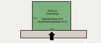 A fenyőerdővel körülvett telek mérete 5755 m2, amely maximális beépíthetősége 30%, lakóépület építése esetén 4,5 m a maximális homlokzat magasság. Az ingatlanra a villany bevezetésre került.