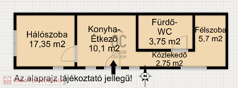 - helyiségei: 1 hálószoba, 1 félszoba, konyha + étkező, közlekedő, fürdő + WC kaptak helyet