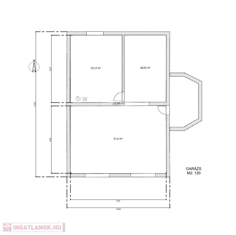 Garázs: 130 m2 nagyságú