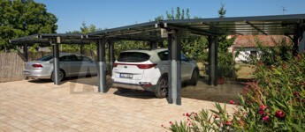A parkolás két autó számára a garázsban, két autónak az udvaron úgy, hogy a mozgásban a 4 autó nem zavarja egymást. Emellett az utcán a ház előtt további 3 autó parkolhat.
