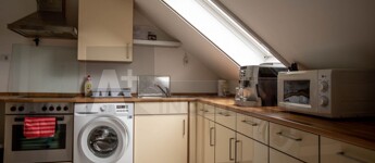 III. lakás: Tetőtéri 74,6 m2. Három szoba, konyha – étkező, kamra, fürdőszoba, külön álló WC és egy szélfogó.