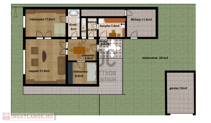 A telken egy 15 m²-es, téglából épült garázs is helyet kapott.