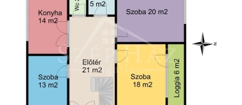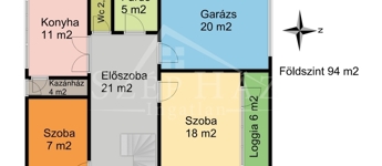 Az alsó szint komfortosan szeparált kialakítással bír: letisztult előszoba, két szoba (az egyik erkélyes), tágas konyha, kamra, fürdő és WC, továbbá közvetlen átjárás a garázsba. Az emeleten további három szoba (ebből egyhez erkély kapcsolódik), konyha, fürdő, WC, valamint egy napfényes előtér található, amelyből egy másik erkélyre léphetünk. A Wc-ből jutunk fel a 4,55 m belmagasságú, beépíthető padlástérbe, mely további lehetőségeket rejt.