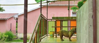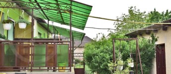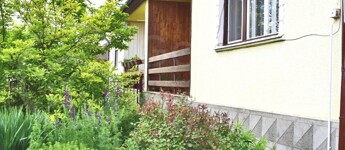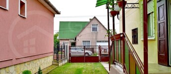 Az udvar dísznövényekkel és díszcserjékkel telepítve. A hátsó kertben gondosan művelt veteményes és termőfák vannak.