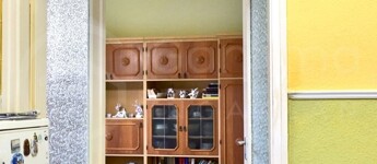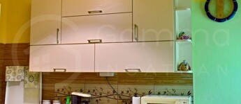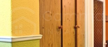 A szobák falai festettek, konyhában, fürdőszobában részben csempézett, előszobában lambériázott. Padló burkolatok hagyományos fa parketta, járólap.